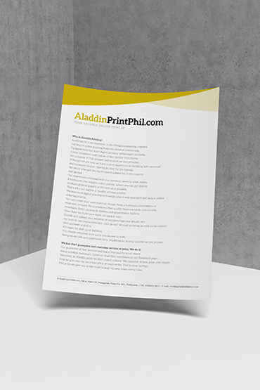 Aladdinprintphil's Letterheads are printed on high quality uncoated specialty paper. Letterheads printed on our high-quality paper look impressive; connote style and elegance.